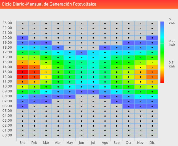 Los resultados del estudio arrojan valores diarios, mensuales y anuales de generación y ofrecen alternativas de optimización en la instalación, como por ejemplo, los ángulos de instalación de los paneles para mejorar la generación según la zona y fecha. Como ejemplo, se muestra el ciclo de generación eléctrica diario promedio para cada mes del año y el promedio mensual para el caso de estudio visto. En el primer gráfico se observan más horas de generación al día en los meses de verano; de 6-20hrs versus de 8-17hrs en invierno. Igualmente los colores indican mayor generación alrededor del mediodía. En el gráfico mensual, se reconoce claramente la estacionalidad del recurso solar; en invierno la generación es muy baja y en verano prácticamente se triplica.