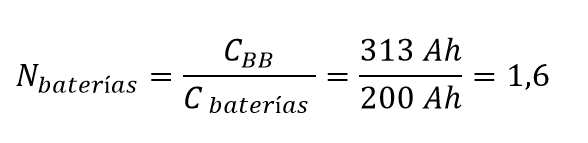 La capacidad de las baterías (Cbaterías) en el mercado está especificado mediante valores estándar, por ello, se debe configurar el banco de tal forma que se especifique un banco de capacidad inmediatamente superior al calculado. Ahora bien, el número de baterías necesario (N) para construir el banco se determina en función de la capacidad individual de cada una de las baterías a utilizar, de forma que: