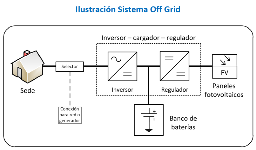 Un buen dimensionamiento de los principales componentes de un sistema FV off grid tiene por finalidad asegurar la fiabilidad del sistema, es decir minimizar las fallas en el sistema y el suministro de energía cuando se requiera, incluso en períodos de baja radiación solar. La metodología se basa en 5 pasos descritos a continuación que parten con la estimación del consumo de energía, luego la selección de los equipos (inversor y regulador de carga) para terminar con el dimensionamiento del banco de baterías y de los paneles FV. Un esquema del arreglo FV se aprecia en la siguiente figura. Para mayor información se invita a revisar la “Guía de Diseño de Sistemas Fotovoltaicos Off-Grid” realizada por la Fundación “Energía Comunitaria” con apoyo de CORFO [3].