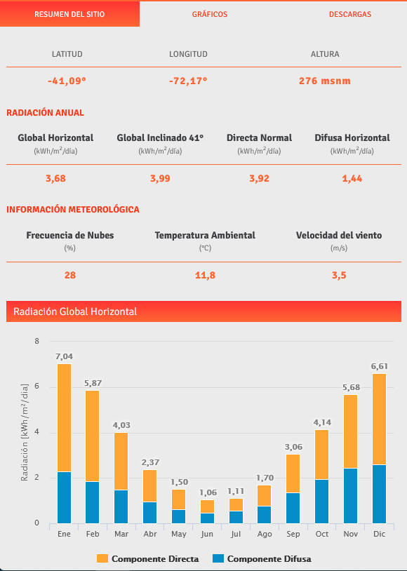 Antes de determinar la cantidad y configuración de los paneles que componen el arreglo, es necesario recolectar variada información sobre el lugar dónde estos serán instalados. Se debe conocer la superficie que está disponible para la instalación de los paneles, dimensiones, inclinación, horas al día que le llega sombra, entre otras cosas. Por otro lado, es necesario conocer los datos meteorológicos del sector: cuantos días al año se tienen días despejados, la radiación solar promedio en cada mes del año (global, directa y difusa), etc. Esta información se puede obtener del “Explorador Solar” del ministerio de energía [4]. En las siguientes figuras se muestran los datos para el lago Todos los Santos.